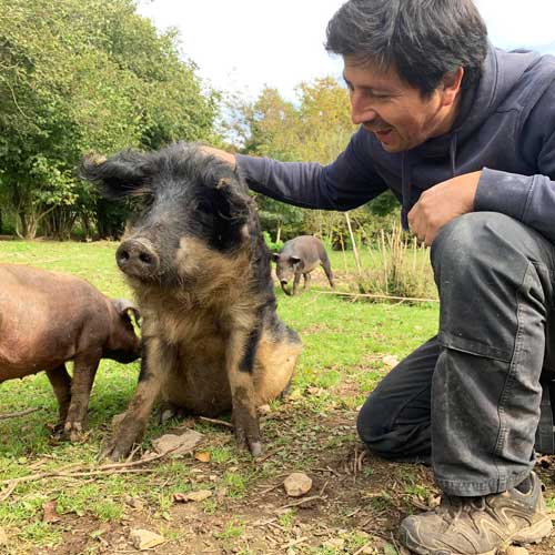 Nous cultivons la terre, nous avons 2 hectares de maraîchage, 2 hectares d’épeautre panifiable, une vingtaine de fruitiers hautes tiges,… Nous élevons aussi des animaux rustiques tels que des vaches Highlands, des vaches Salers, des porcs laineux. Nous avons aussi des chevaux Haflingers et un mulet, des poules,…